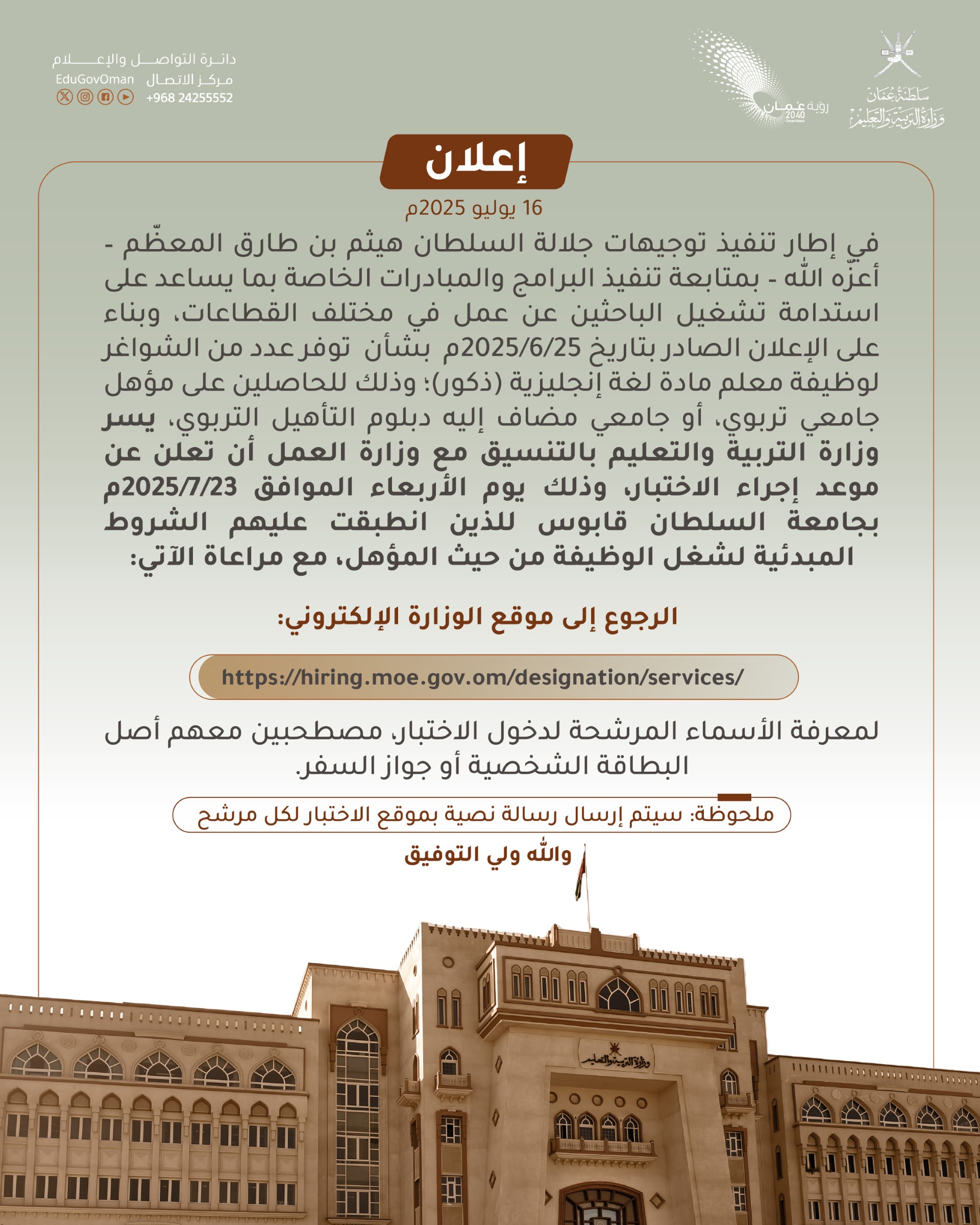 وظيفة معلم مادة لغة انجليزية (ذكور) سلطنة عمان